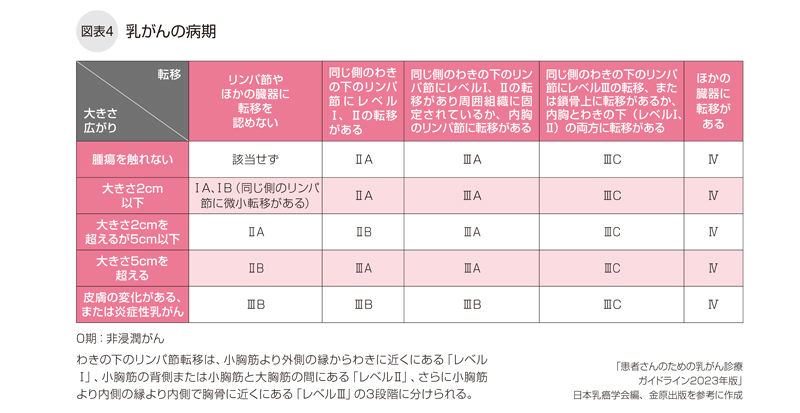 病期(ステージ)は、自分の病気の状態や予後(治療の見込み)を知り、治療法を決めるうえで重要な指標となります。乳がんの病期は、腫瘍の大きさと広がり、そして、周辺のリンパ節やほかの臓器への転移の有無などによって、0、ⅠA、ⅠB、ⅡA、ⅡB、ⅢA、ⅢB、ⅢC、Ⅳ期まで9段階に分けられます。0期は非浸潤がん、Ⅰ期以上は浸潤がんで、Ⅳ期に近いほど進行した状態です(図表4)。