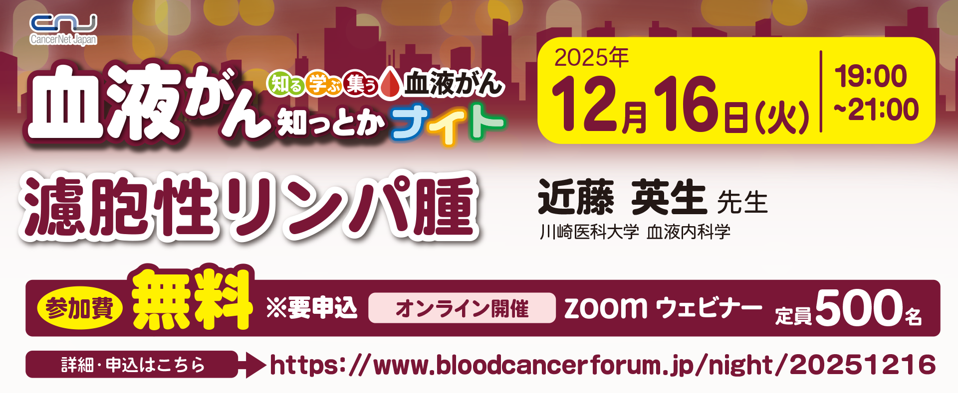 NPO法人キャンサーネットジャパン > イベント情報 > 【第22回】血液がん知っとかナイト「濾胞性リンパ腫」 【第22回】血液がん知っとかナイト「濾胞性リンパ腫」 Tweet シェアする 開催日 2025年12月16日(火) 開催時間 19:00~21:00 場所 オンライン(zoomウェビナー)