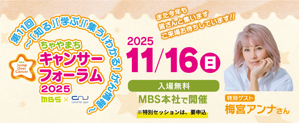 がんと向き合うすべての方にとって、有意義な一日となるよう、盛りだくさんの内容でお待ちしております。ぜひご家族・ご友人とお誘い合わせのうえ、ご来場ください。