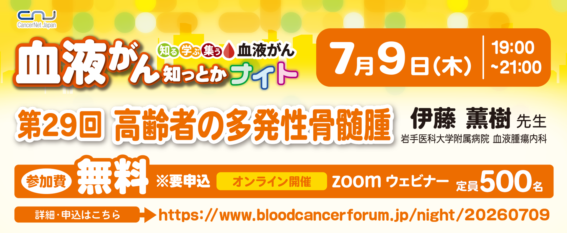 NPO法人キャンサーネットジャパン > イベント情報 > 【第29回】血液がん知っとかナイト「高齢者の多発性骨髄腫」
