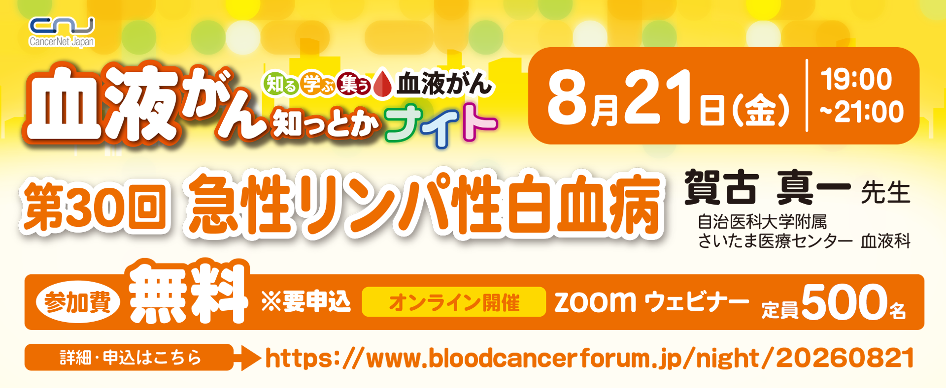 NPO法人キャンサーネットジャパン > イベント情報 > 【第30回】血液がん知っとかナイト「急性リンパ性白血病」