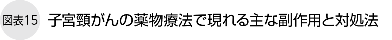 前者の代表である吐き気や嘔吐は、事前に制吐剤(吐き気止め)を服用することでコントロールできるようになってきました。手足のしびれや痛み、腫れのような末梢神経症状や手足症候群は早めの治療が必要です。図表15に対処法を示してあります。どんな副作用が起こるかをあらかじめ知っておけば、対応できることも多く、治療の中断や中止を避けられます。