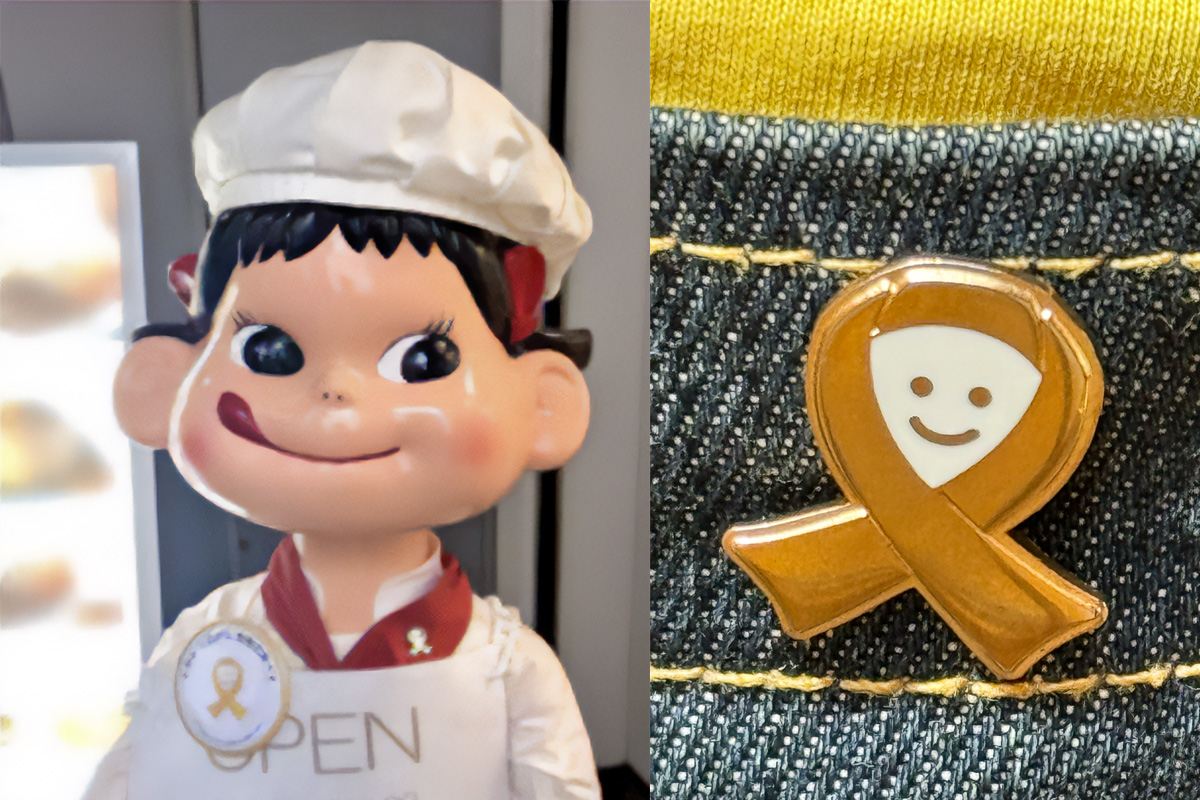 2024年9月1日(日)~9月30日(月)の営業時間内、昨年同様に東京都と神奈川県内の菓子店やレストラン44店舗で「ペコちゃん」がゴールドリボンのピンズを着用し、啓発活動に協力してくれました。