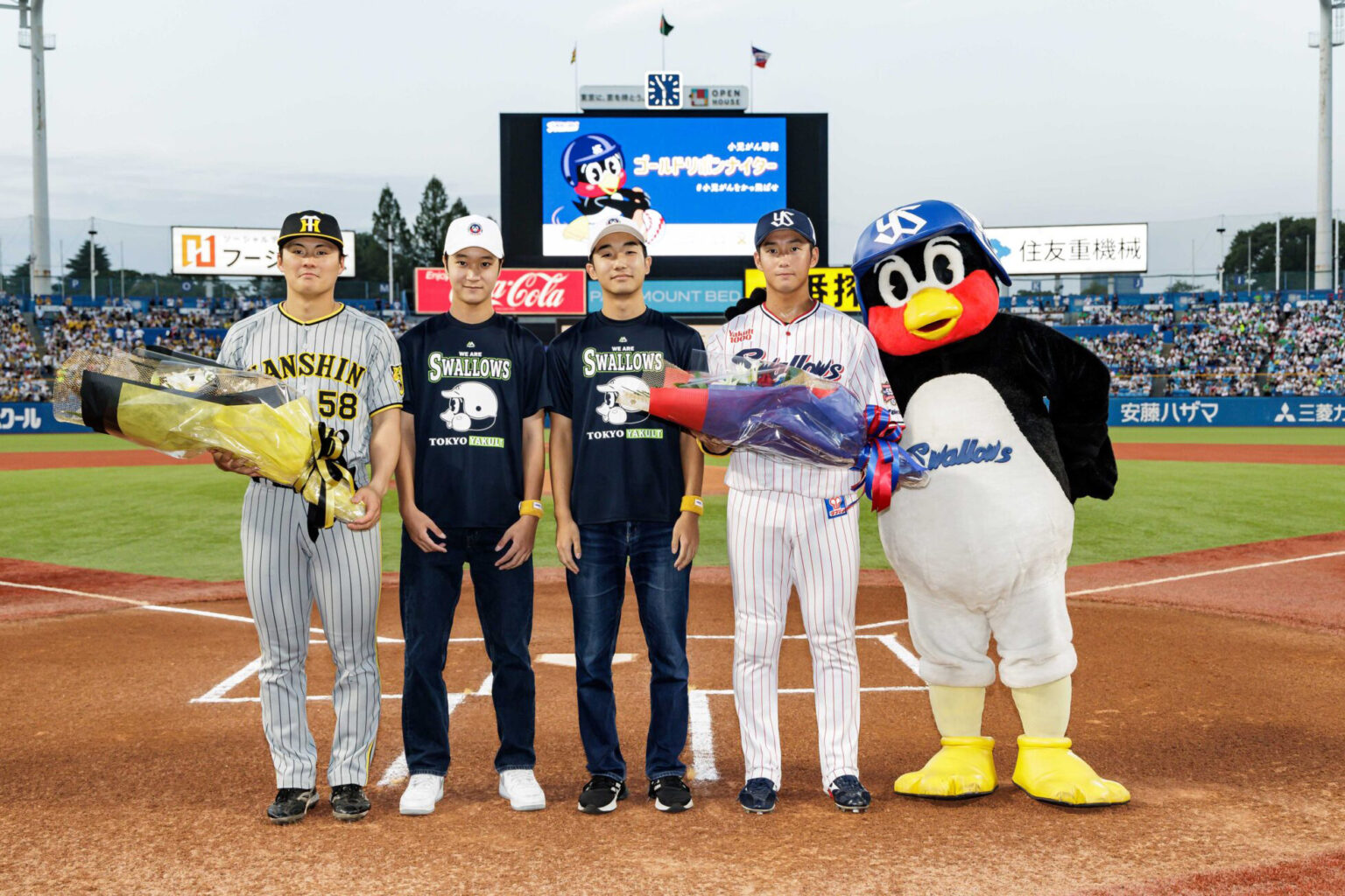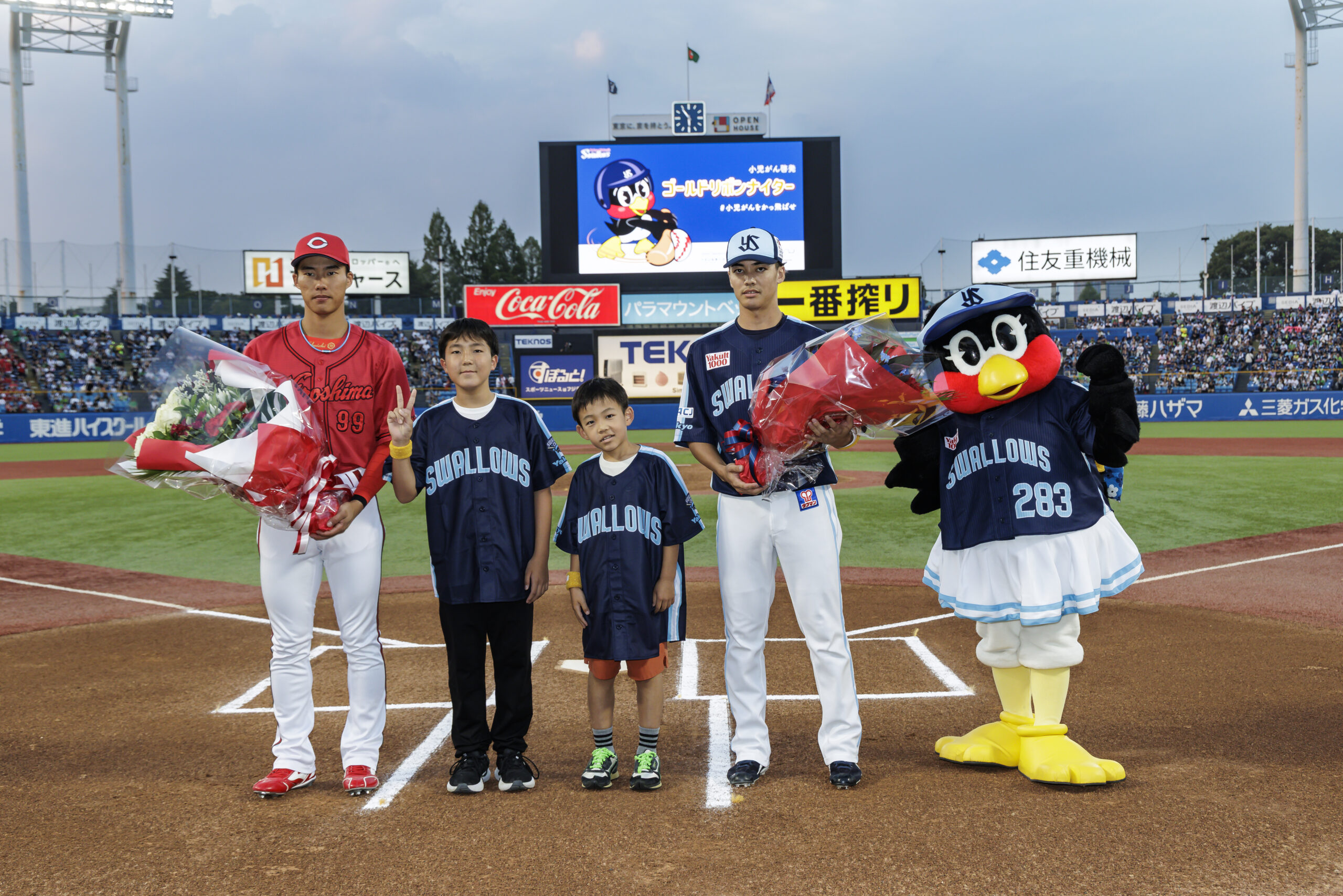 2025年8月30日、明治神宮野球場での東京ヤクルトスワローズ 対 広島東洋カープ戦をゴールドリボンナイター2025として冠協賛いたしました。小児がんサバイバーときょうだい児、ご家族約50名を招待し、来場された一般の方々に小児がんのことについて関心を持ってもらえるように、始球式、花束贈呈などのセレモニーを行いました。球場のスワローズ側入場口では、選手が着用するものと同じゴールドリストバンドと、オリジナルうちわをプレゼントしました。