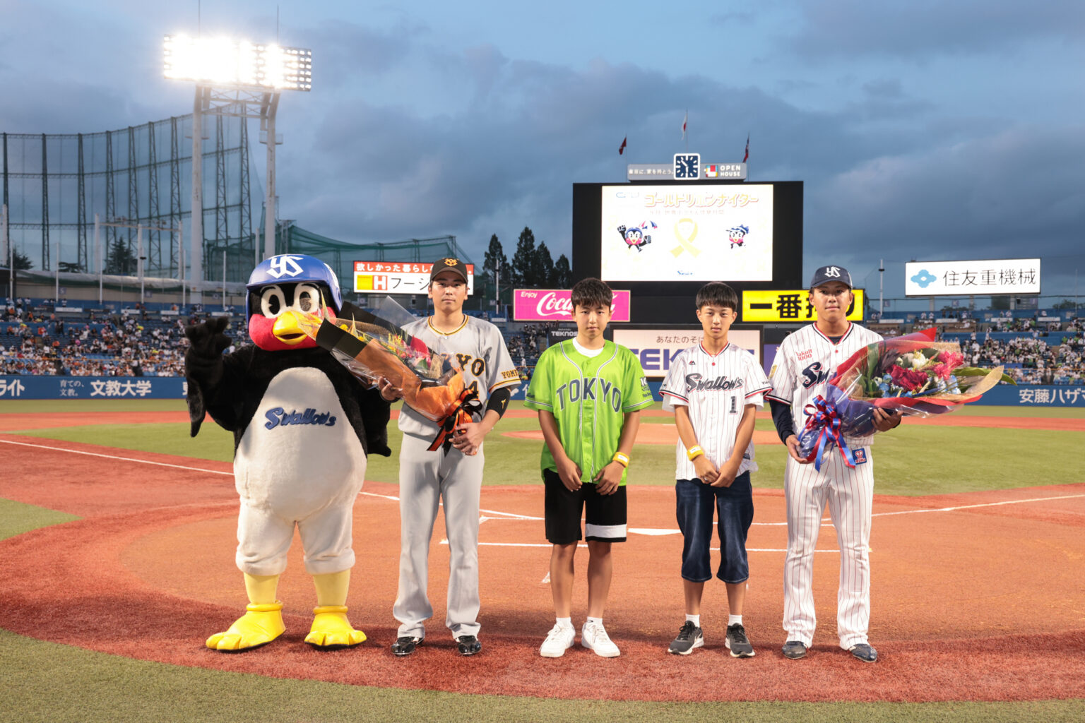 2022年9月13日に神宮球場で、東京ヤクルトスワローズ 対 読売ジャイアンツ戦を「キャンサーネットジャパン presents ゴールドリボンナイター」として冠協賛いたしました。当日は小児がんの治療経験のある子どもたちとご家族合わせて50名を球場へ招待し、サバイバーによる始球式や贈呈式などのセレモニーを実施しました。