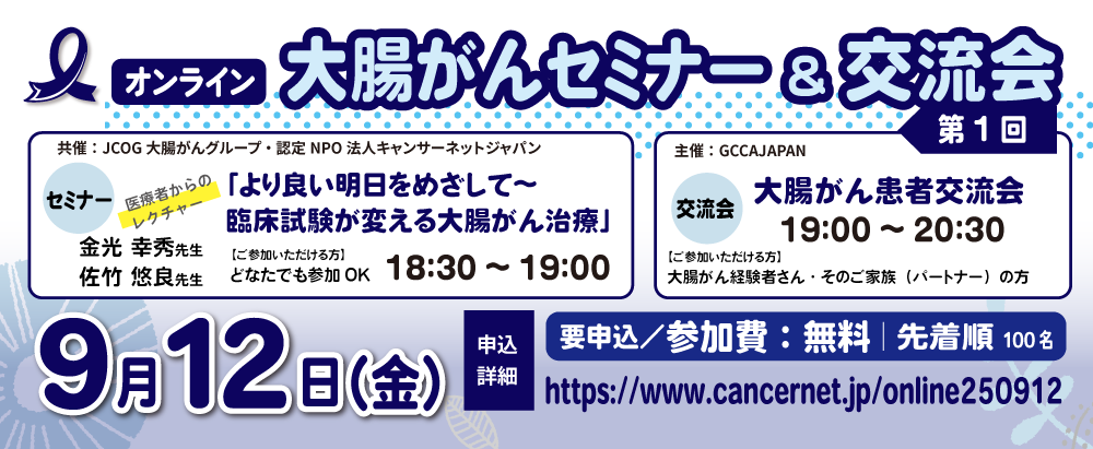 NPO法人キャンサーネットジャパン > イベント情報 > 【オンライン】第1回 大腸がんセミナー&患者交流会