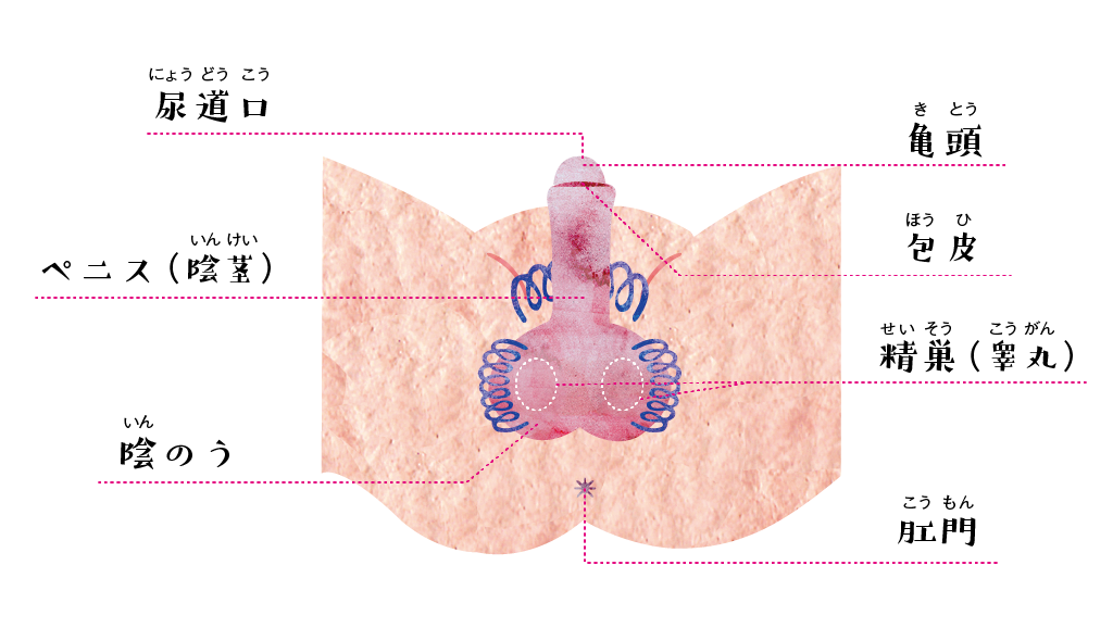 男の子のペニスのうしろには、陰のうと呼ばれる袋に入った精巣が2つついていて、いのちのもとになる精子がつくられています。前立腺や精のうから出てくる液に精子が混じったものを精液といいます。ペニスは陰茎とも呼びます。ペニスを覆っている皮を包皮、ペニスの先を亀頭といいます。精巣は睾丸とも呼びます。女の子とちがって、男の子はおしっこも精液も同じようにペニスの穴である尿道口から出てきますが、混じらないしくみになっています。