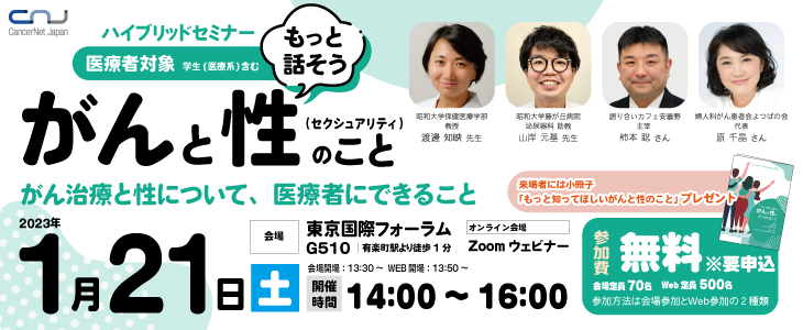 【がんと性】イベント 開催終了【医療者対象ハイブリッドセミナー】もっと話そうがんと性(セクシュアリティ)のこと イベントその他 2022.12.23 開催終了【オンライン】AYA week 2022イベント:病気になったAYA世代の恋愛・結婚どうする? イベント共通 2022.01.13 本事業は日本対がん協会の協力による休眠預金活用事業です。
